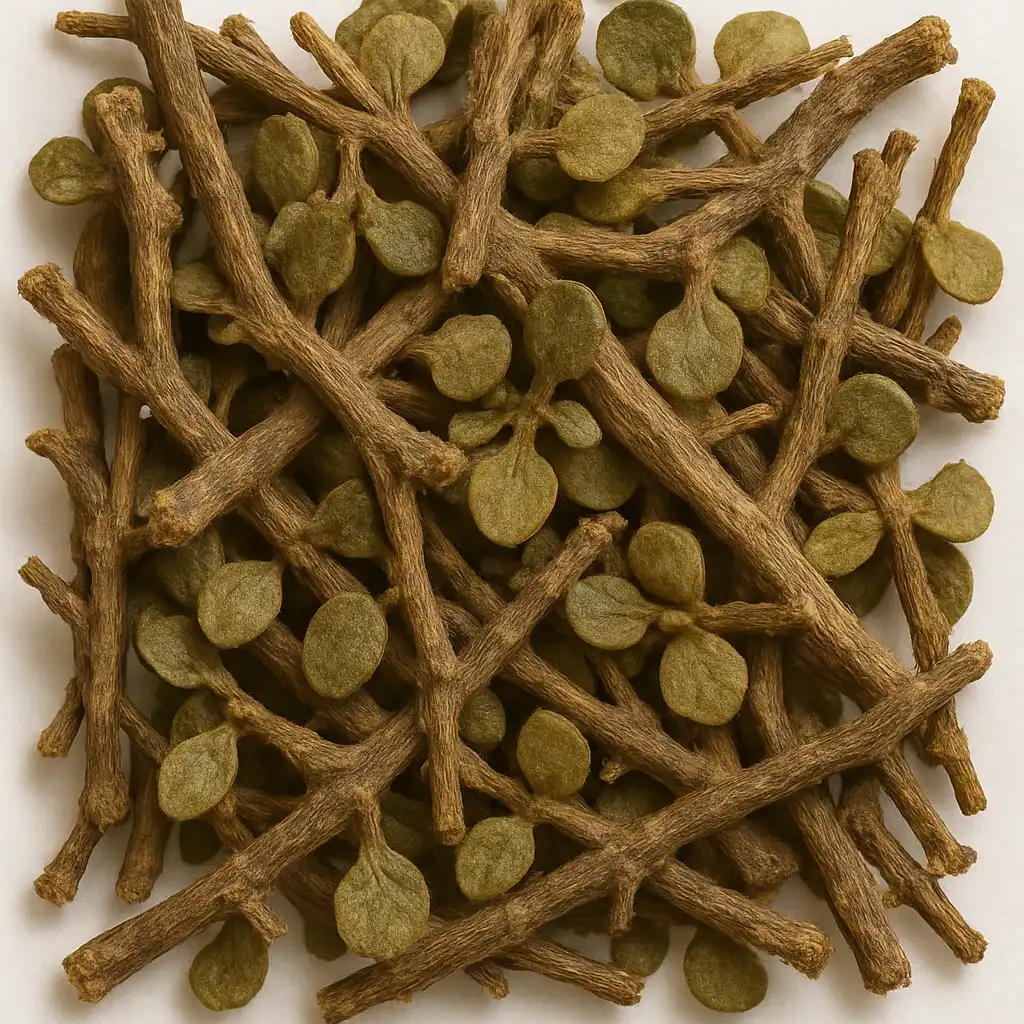 Bacopa, also known as Brahmi or Waterhyssop, is a medicinal herb native to India with a long-standing use in Ayurvedic practices. It is a small creeping plant from the Plantaginaceae family, characterized by its thick, fleshy leaves arranged opposite each other along the stems. The leaves of Bacopa monnieri, though bitter in taste, are widely recognized for their medicinal value. Bacopa is available in several forms including dried leaves, leaf powder, capsules, and extracts.
